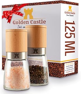 Golden Castle | 2 Salz und Pfeffermühle Holz | Extra leichtgängiges Keramikmahlwerk inkl. Deckel | Zerkleinert Salz, Pfeffer und Gewürze im Handumdrehen | Profi Gewürzmühle | Pfeffer und Salzmühle