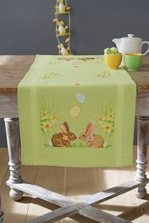 Vervaco Läufer Kaninchen/Ostern Kreuzstichpackung Stickpackung enthält vorgedruckter Tischläufer, Garn, Nadel und Anleitung. 40 x 100 cm, Aida, weiß, 40 x 100 x 0,3 cm