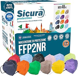 48 CE-zertifizierte FFP2-Masken Made in Italy BFE ≥99% Mix 12 Farben Blau, Orange, Rot, Schwarz, Blau, Grün, Apfelgrün, Gelb, Turteltauben, Lila, Pink, Lavendel