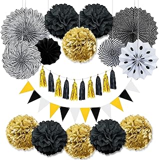 LyximGss Schwarz Gold Party Deko Set - DIY Pompoms Blumen, Quaste Girlande, Luftballons, Polka Dot Papier Girlande, Spiral Girlanden, für Abschlussfeier und Ruhestandsfeierdekor